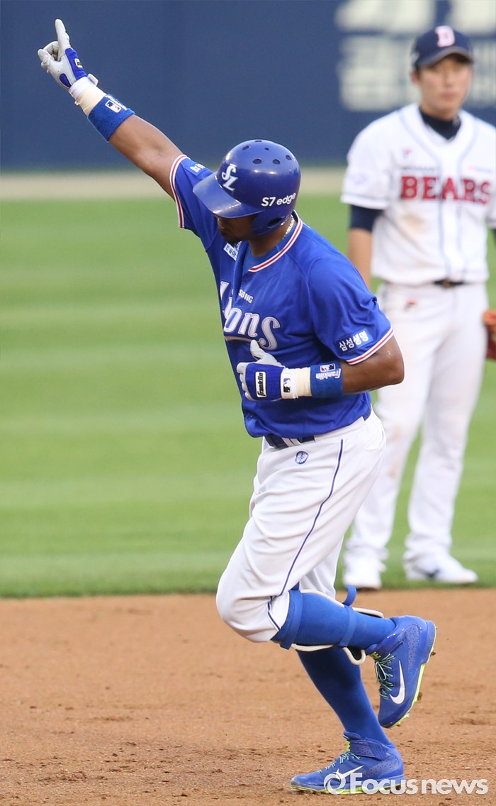 (서울=포커스뉴스) 20일 서울 잠실구장에서 열린 2016 프로야구 삼성-두산 경기 3회초 2사후 삼성 발디리스가 좌월 만루홈런을 치고 오른손을 번쩍 치켜들고 3루를 향해 달리고 있다.