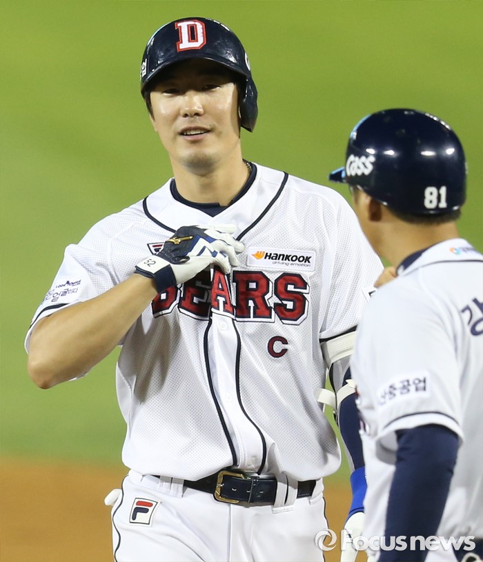 (서울=포커스뉴스) 20일 서울 잠실구장에서 열린 2016 프로야구 삼성-두산 경기 7회말 2사 2루에서 두산 김재호가 중전 적시타로 주자를 불러 들이고 1루에서 기뻐하고 있다.