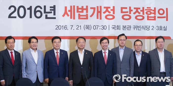 (서울=포커스뉴스) 21일 오전 서울 여의도 국회 귀빈식당에서 열린 2016년 세법개정 당정협의에 참석한 유일호 경제부총리 겸 기획재정부 장관과 의원들이 취재진을 향해 포즈를 취하고 있다. 왼쪽부터 이현재 새누리당 정책위부의장, 심재철 국회 부의장, 김광림 정책위의장, 유 부총리, 조경태 기획재정위원장, 이명수 민생특위 위원장, 이채익 정책위부의장, 오정근 혁신비대위원.