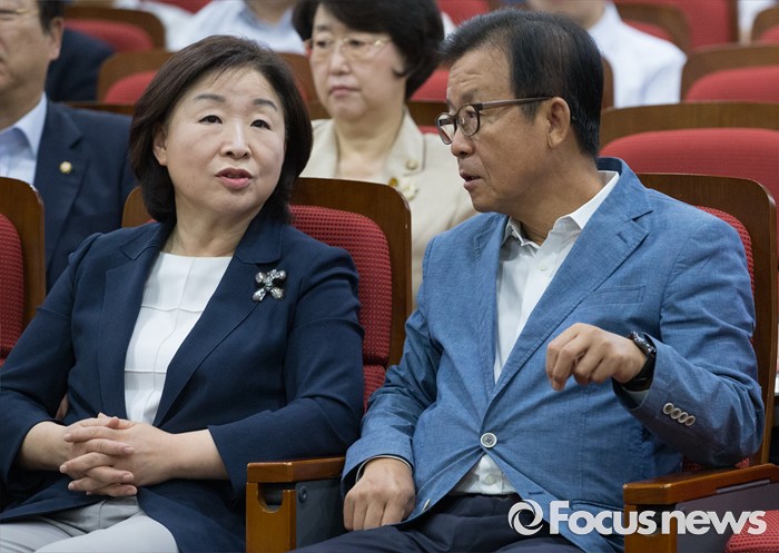 (서울=포커스뉴스) 21일 오전 서울 여의도 국회 의원회관에서 열린 퓨처라이프포럼 2기 출범식 및 세미나에 참석한 원혜영(오른쪽) 더불어민주당 의원과 심상정 정의당 상임대표가 대화하고 있다.