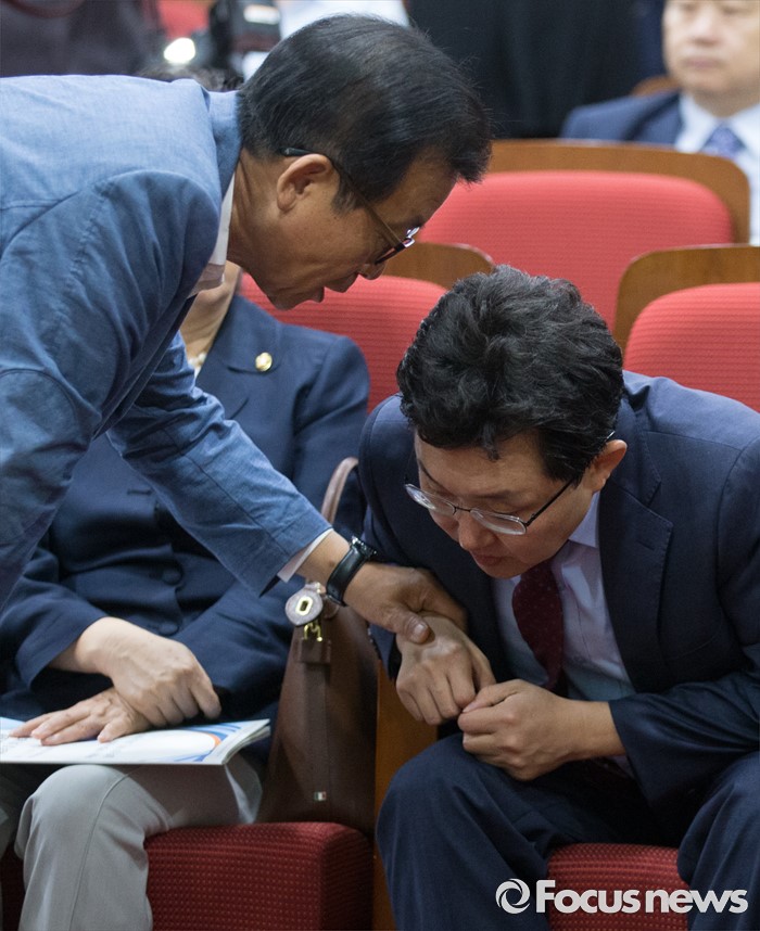 (서울=포커스뉴스) 21일 오전 서울 여의도 국회 의원회관에서 열린 퓨처라이프포럼 2기 출범식 및 세미나에 참석한 김용태(오른쪽) 새누리당 의원과 포럼 공동대표인 원혜영 더불어민주당 의원이 대화하고 있다.