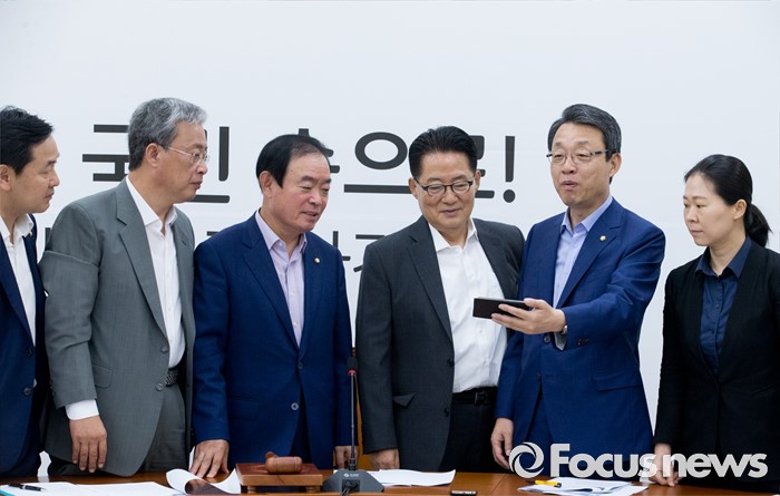 (서울=포커스뉴스) 21일 오전 서울 여의도 국회에서 열린 국민의당 원내정책회의에 참석한 박지원 비대위원장과 김성식 정책위의장 등 의원들이 당사에서 진행 중인 사드배치 반대 필리버스터 온라인 방송을 핸드폰으로 시청하고 있다. 왼쪽부터 김관영 원내수석부대표, 유성엽 교육문화체육관광위원장, 장병완 산업통상자원위원장, 박 비대위원장, 김 정책위의장, 권은희 정책위수석부의장.
