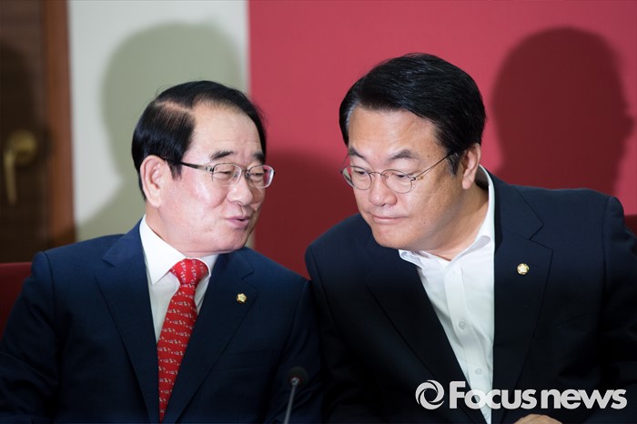 (서울=포커스뉴스) 정진석(오른쪽) 새누리당 원내대표와 박명재 사무총장이 21일 오전 서울 여의도 새누리당사에서 열린 혁신비상대책위원회의에 참석해 대화 하고 있다.