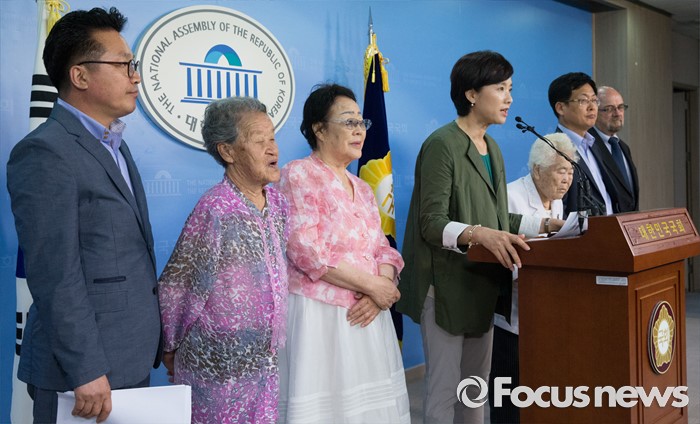 (서울=포커스뉴스) 21일 오전 서울 여의도 국회 정론관에서 유은혜 더불어민주당 의원, 최성 고양시장, 이용수, 박옥선, 이옥선 할머니 등이 위안부 특별법 입법 청원 기자회견을 하고 있다.