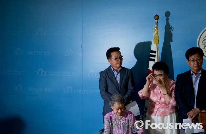 (서울=포커스뉴스) 21일 오전 서울 여의도 국회 정론관에서 유은혜 더불어민주당 의원, 최성 고양시장, 이용수, 박옥선, 이옥선 할머니 등이 위안부 특별법 입법 청원 기자회견을 하고 있다.