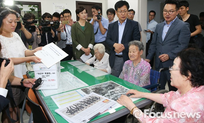 (서울=포커스뉴스) 21일 오전 서울 여의도 국회 정론관에서 유은혜 더불어민주당 의원, 최성 고양시장, 이용수, 박옥선, 이옥선 할머니 등이 위안부 특별법 입법 청원 기자회견을 마친 뒤 민원실을 찾아 청원서를 제출하고 있다.