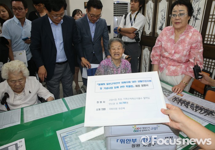 (서울=포커스뉴스) 21일 오전 서울 여의도 국회 정론관에서 유은혜 더불어민주당 의원, 최성 고양시장, 이용수, 박옥선, 이옥선 할머니 등이 위안부 특별법 입법 청원 기자회견을 마친 뒤 민원실을 찾아 청원서를 제출하고 있다.