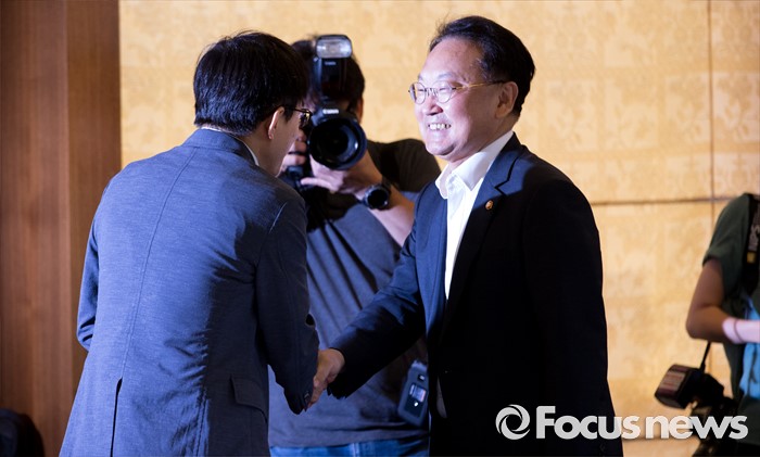 (서울=포커스뉴스) 유일호 경제부총리 겸 기획재정부 장관이 21일 오전 서울 중구 프레스센터에서 열린 기획재정부 재정정책 자문회의에서 참석자들과 인사를 나누고 있다.