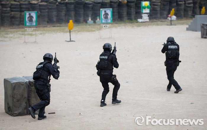 (서울=포커스뉴스) 21일 오전 서울 서초구 경찰특공대에서 경찰 특공대원들이 대테러 훈련을 하고 있다.
