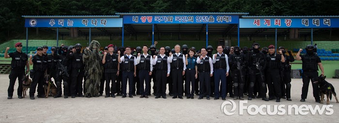 (서울=포커스뉴스) 김종인 더불어민주당 비상대책위원회 대표와 안전행정위원들이 21일 오전 서울 서초구 경찰특공대를 방문해 대테러 훈련 시범 참관을 마치고 경찰특공대원들과 함께 기념사진을 찍고 있다.
