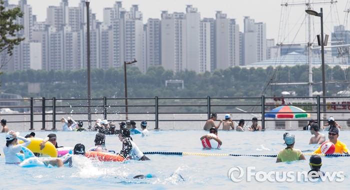 (서울=포커스뉴스) 21일 오후 서울 광진구 뚝섬 한강공원 수영장을 찾은 시민들이 물놀이를 즐기고 있다.