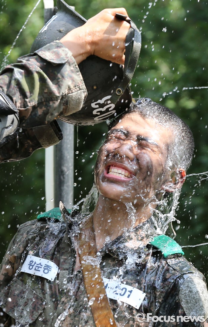 (논산=포커스뉴스) 폭염경보가 발령된 21일 충남 논산 연무읍 육군훈련소 각개전투종합훈련장에서 26교육연대 3교육대 훈련병들이 훈련을 받고 샤워를 하며 더위를 식히고 있다.