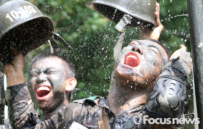 (논산=포커스뉴스) 폭염경보가 발령된 21일 충남 논산 연무읍 육군훈련소 각계전투종합훈련장에서 26교육연대 3교육대 훈련병들이 훈련을 받고 샤워를 하며 더위를 식히고 있다.