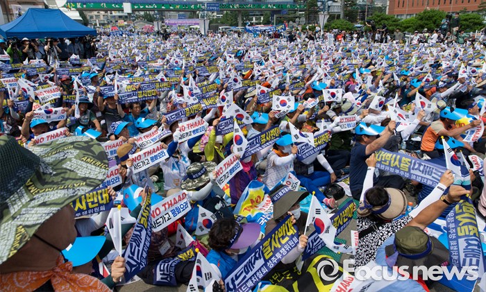 (서울=포커스뉴스) 21일 오후 서울역 광장에서 사드 배치 반대를 요구하는 경북 성주군민 2천여 명이 대규모 상경집회를 하고 있다.