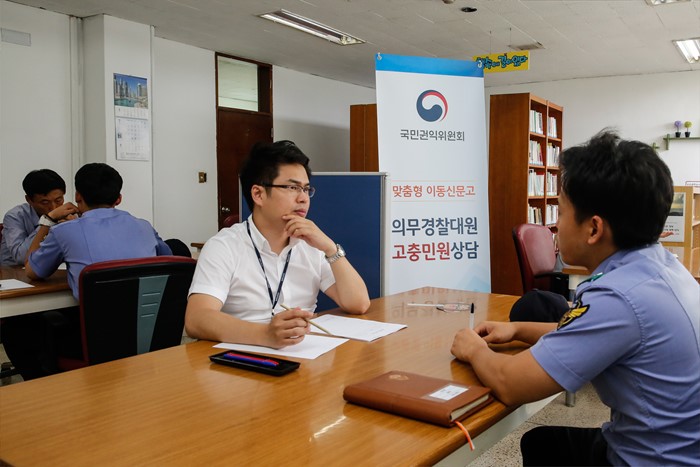 (서울=포커스뉴스) 21일 인천 중구 해양경비안전서 대강당에서 국민권익위원회 직원이 중국 어선의 불법조업 단속과 해안 치안 지원 업무를 맡고 있는 의무경찰을 대상으로 '정부3.0 맞춤형 이동 신문고'를 운영하고 있다. <사진제공=국민권익위원회>