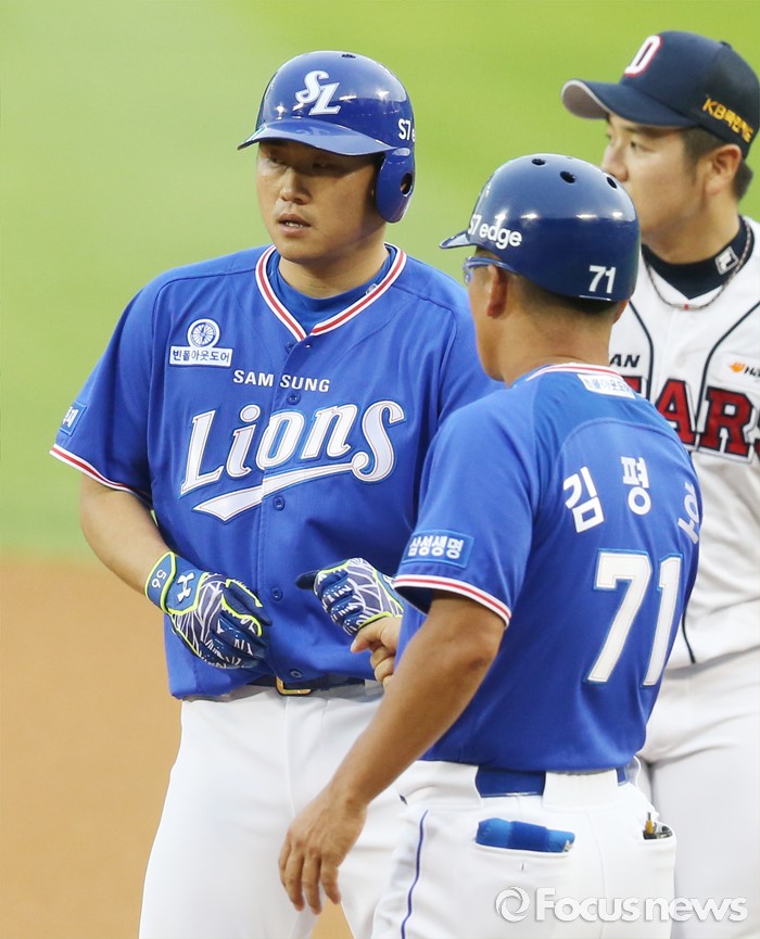 (서울=포커스뉴스) 21일 서울 잠실구장에서 열린 2016 프로야구 삼성-두산 경기 2회초 1사 2,3루에서 삼성 이지영이 2타점 우전 안타를 치고 1루에서 김평호 코치와 주먹을 마주치고 있다.