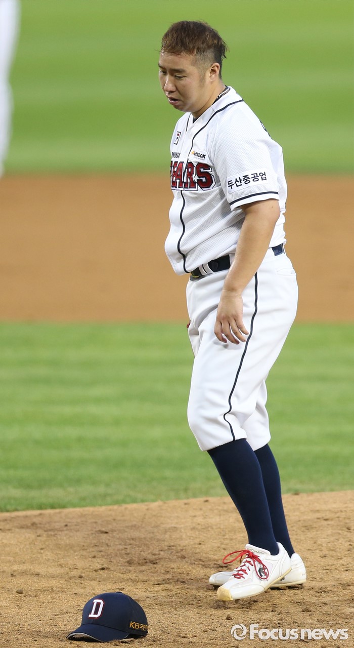 (서울=포커스뉴스) 21일 서울 잠실구장에서 열린 2016 프로야구 삼성-두산 경기에서 두산 선발투수 유희관이 3회 투구 도중 벗겨진 모자를 바라보고 있다.