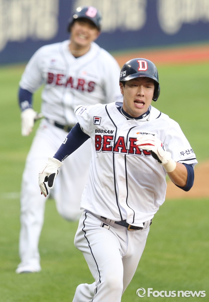 (서울=포커스뉴스) 21일 서울 잠실구장에서 열린 2016 프로야구 삼성-두산 경기 1회말 무사 1,2루에서 두산 민병헌의 우익수를 넘기는 2루타때 2루주자 박건우가 홈을 향해 달리고 있다. 뒤는 1루주자 김재환.
