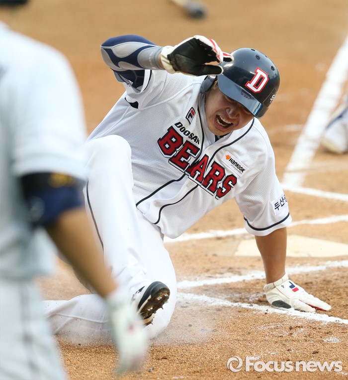 (서울=포커스뉴스) 21일 서울 잠실구장에서 열린 2016 프로야구 삼성-두산 경기 1회말 무사 1,2루에서 두산 민병헌의 우익수를 넘기는 2루타때 1루주자 김재환이 홈에서 슬라이딩하며 세이프되고 있다.