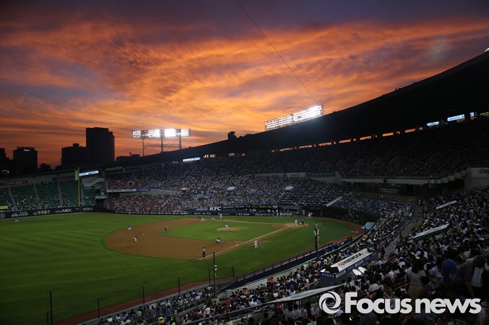 (서울=포커스뉴스) 21일 2016 프로야구 삼성-두산 경기가 열린 서울 잠실구장을 덮은 빨간 노을이 박진감 있는 경기와 더불어 또 하나의 아름다움을 관중들에게 선사하고 있다.