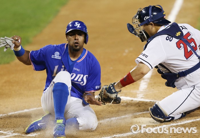 (서울=포커스뉴스) 21일 서울 잠실구장에서 열린 2016 프로야구 삼성-두산 경기 6회초 1사 만루에서 삼성 김상수의 중견수 희생플라이때 3루주자 발디리스가 홈으로 뛰어들어 세이프되고 있다.
