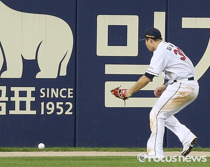 (서울=포커스뉴스) 21일 서울 잠실구장에서 열린 2016 프로야구 삼성-두산 경기 4회초 두산 좌익수 김재환이 삼성 백상원의 뜬공 타구를 놓치고 있다.