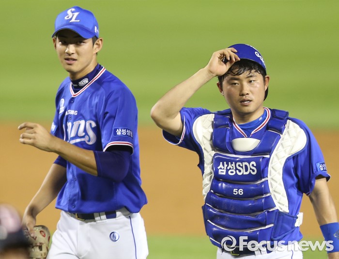 (서울=포커스뉴스) 21일 서울 잠실구장에서 열린 2016 프로야구 삼성-두산 경기에서 두산에 이틀 연속 승리한 삼성의 구자욱과 이지영이 경기를 마치고 더그아웃으로 향하고 있다.