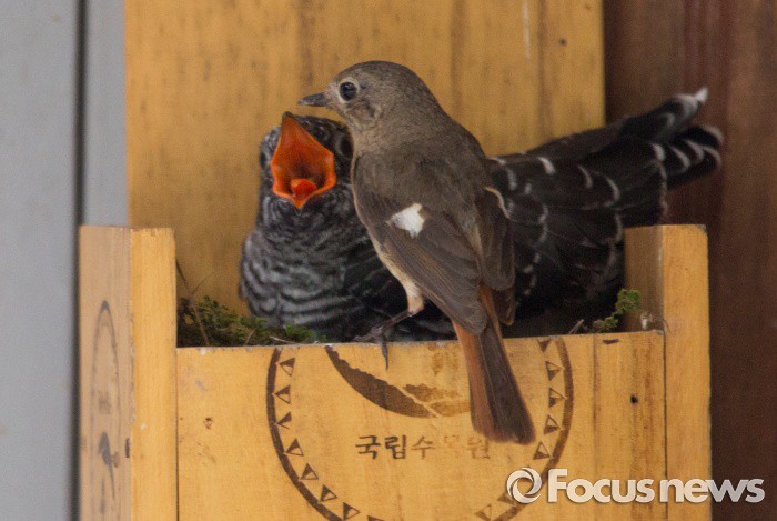 (포천=포커스뉴스) 딱새 암컷이 21일 경기도 포천시 소홀읍 국립수목원 광릉숲 관리동 우편함에서자식 행세를 하는 뻐꾸기 유조를 바라보고 있다.