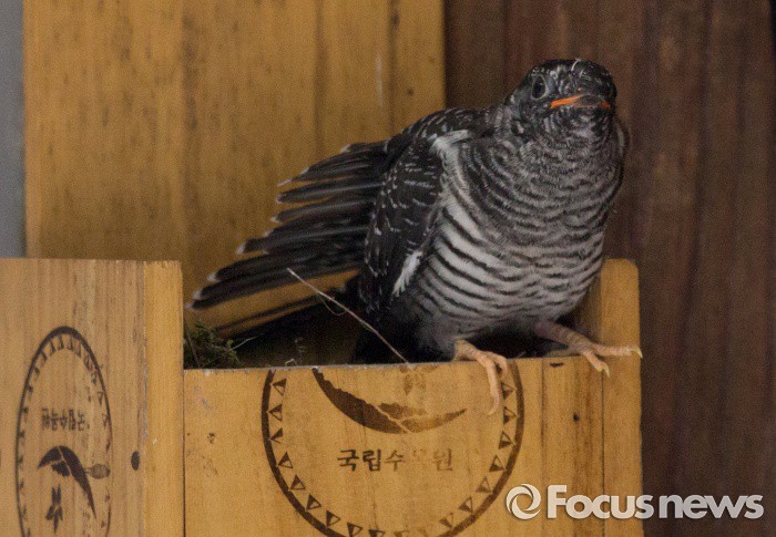 (포천=포커스뉴스) 뻐꾸기 유조가경기도 포천시 소홀읍 국립수목원 광릉숲 관리동사 우체통에서 자신을 대리로 키워주는 딱새어미를 기다리고 있다.