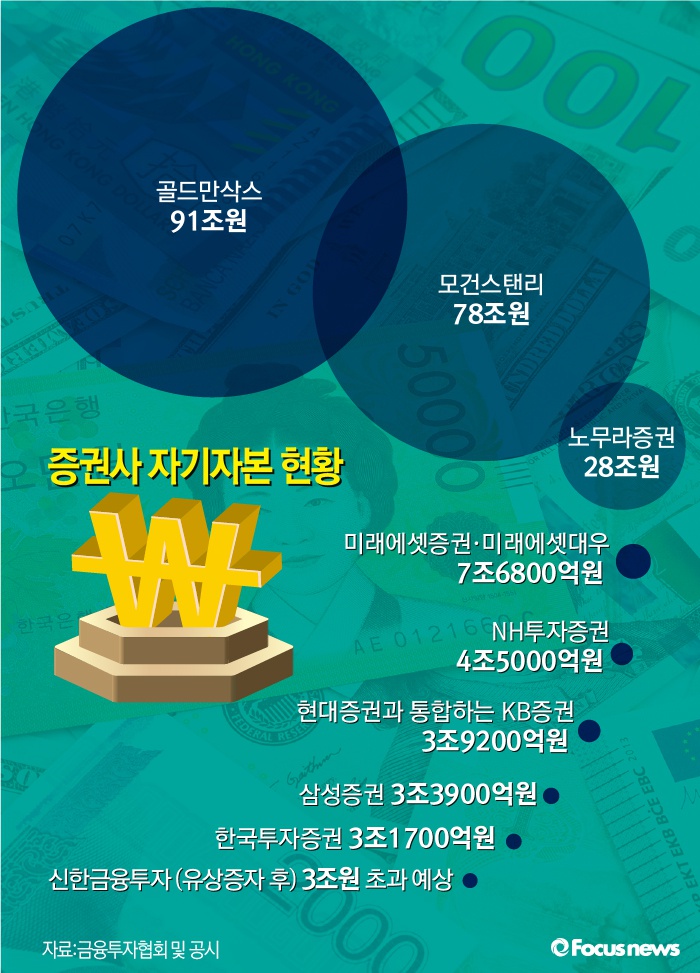현재 자기자본 3조원을 넘는 증권사는 미래에셋증권·미래에셋대우(7조6800억원),NH투자증권(4조5000억원), 현대증권과 통합하는 KB증권(3조9200억원), 삼성증권(3조3900억원), 한국투자증권(3조1700억원) 등이다. 여기에 최근 5000억원 이상의 유상증자를 추진하기로 한 신한금융투자까지 포함하면 총 6곳이다.