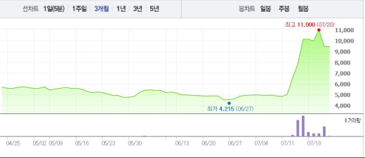 포켓몬 GO는 미국, 캐나다, 호주 등에 시범 출시된 상태며 현재 앱 매출 순위에서 최상위권에 올라갔다. 한국에서도 포켓몬 GO 열풍이 불고 있다. 한빛소프트는 쿠킹 오디션 VR, 헬게이트 VR 등 총 5가지의 VR 콘텐츠를 개발하고 있어 주목을 받았다.주가흐름<사진출처=네이버 캡쳐>