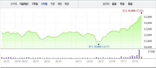 NEW는 22일 오전 9시25분 현재 전 거래일 대비 2.35%(350원) 상승한 1만5250원에 거래되고 있다. NEW는 15일부터 1~5%의 상승폭을 기록했다.