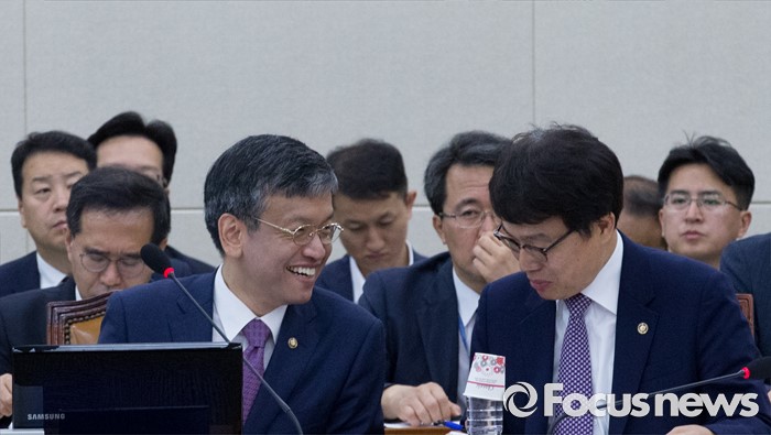(서울=포커스뉴스) 22일 오전 서울 여의도 국회에서 열린 저출산·고령화대책 특별위원회 전체회의에 참석한 최상목(왼쪽) 기획재정부 1차관과 고영선 고용노동부 차관이 대화하고 있다.
