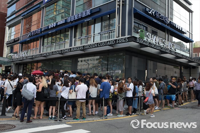 (서울=포커스뉴스) 22일 오전 서울 강남구 쉐이크쉑 국내 1호점 매장 앞에 시민들이 오픈을 앞두고 줄을 서고 있다.