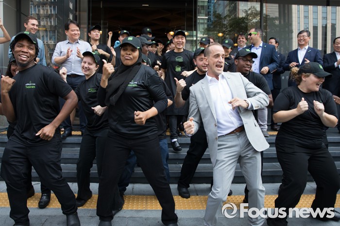 (서울=포커스뉴스) 22일 오전 서울 강남구 쉐이크쉑 국내 1호점 매장 오픈 행사에서 랜디 가루티 쉐이크쉑 CEO와 직원들이 춤을 추고 있다.