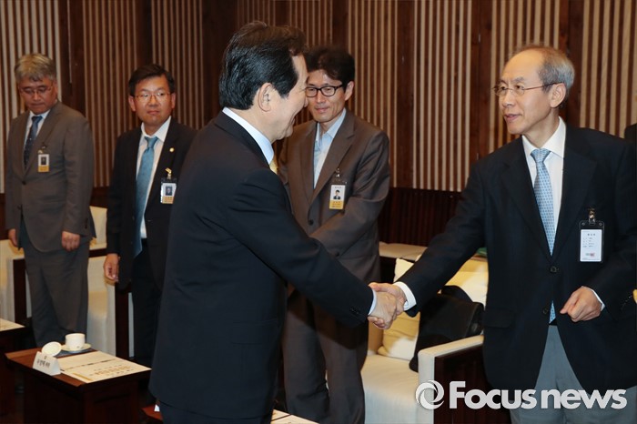 (서울=포커스뉴스) 22일 오전 서울 여의도 국회 의장접견실에서 열린 국회 공직자윤리위원회 위촉식에 참석한 정세균(왼쪽 세번째) 국회의장과 윤성식(오른쪽 첫번째) 위원장 등 위원들과 인사하고 있다.