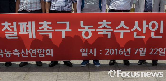 (서울=포커스뉴스) 22일 오후 서울정부청사 앞에서 열린 과잉규제 철폐촉구 농수축산인 기자회견에 참석한 한국농축산연합회 회원들이 김영란법을 반대하는 현수막을 펼치고 있다.