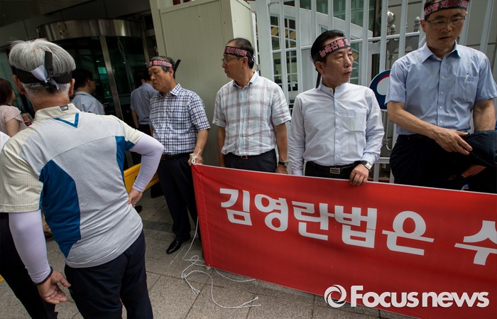 (서울=포커스뉴스) 22일 오후 서울정부청사 후문에서 한국농축산연합회 회원들이 김영란법 반대 집회를 갖고 있다.