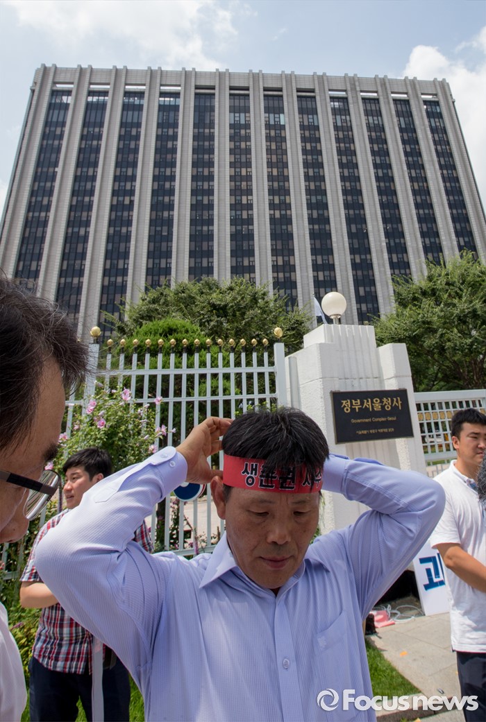 (서울=포커스뉴스) 22일 오후 서울정부청사 앞에서 열린 과잉규제 철폐촉구 농수축산인 기자회견에 참석한 한국농축산연합회 회원들이 머리띠를 두르고 있다.