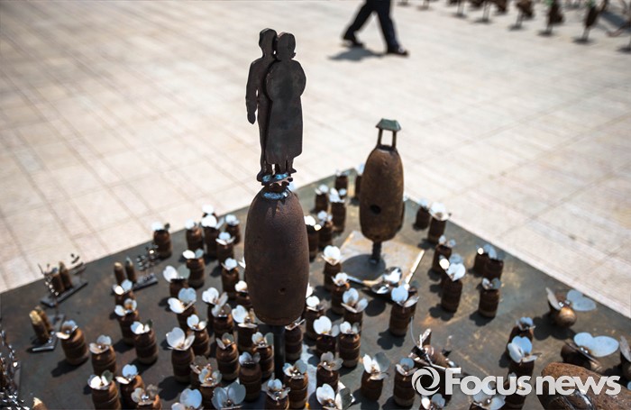 (서울=포커스뉴스) 22일 오후 서울 중구 서울광장에서 '전쟁 없는 세상을 위한 에이이브이(Art's Eye View) 프로젝트 전시가 열리고 있다. 미공군의 사격장으로 쓰였던 경기도 매향리에서 반출된 포탄 및 탄피를 활용, 1000여점의 예술작품으로 만든 이번 전시는 오는 24일까지 열릴 예정이다.