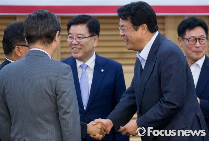 (서울=포커스뉴스) 22일 오후 서울 여의도 국회 의원회관에서 열린 '격차해소를 위한 해법, 왜 중향평준화인가?' 세미나에 참석한 정진석 새누리당 원내대표가 참석자들과 인사하고 있다.