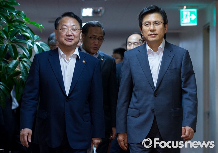 (서울=포커스뉴스) 22일 오후 서울정부청사에서 열린 임시 국무회의에 황교안(오른쪽) 국무총리와 유일호 경제부총리 및 기획재정부 장관이 참석하며 대화를 나누고 있다. 정부는 이날 국무회의에서 추경의 세부안을 확정해 26일 국회에 제출할 계획이다.
