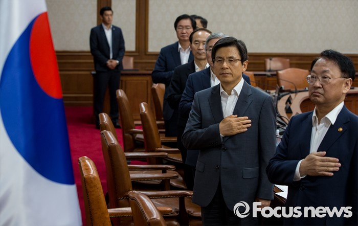 (서울=포커스뉴스) 22일 오후 서울정부청사에서 열린 임시 국무회의에 참석한 황교안 국무총리 및 국무위원들이 국민의례를 하고 있다. 정부는 이날 국무회의에서 추경의 세부안을 확정해 26일 국회에 제출할 계획이다.