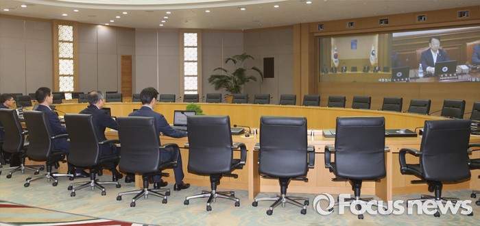 (세종=포커스뉴스) 22일 오후 세종시 정부세종청사 국무회의장에서 열린 임시국무회의에서 국무위원들이 영상을 통해 회의에 참여하고 있다.