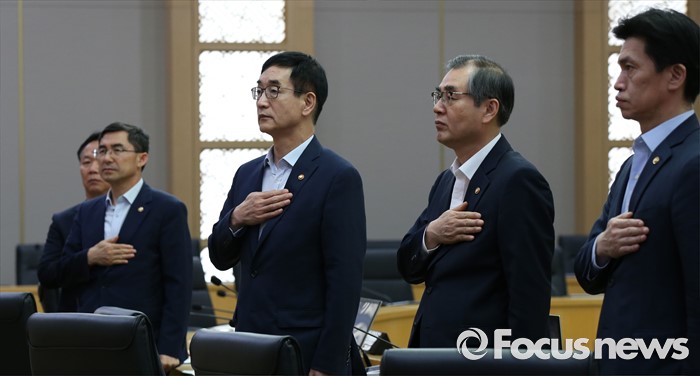 (세종=포커스뉴스) 22일 오후 세종시 정부세종청사 국무회의장에서 열린 임시국무회의에서 국무위원들이 국기에 대한 경례를 하고 있다.