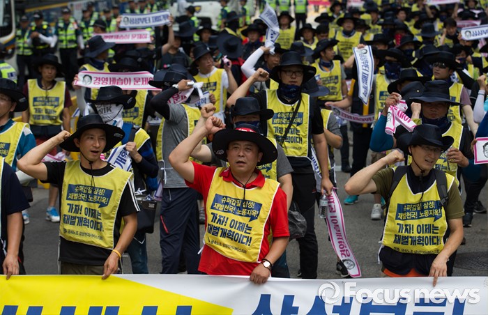 이에 대해 기아차 노조는 "현대차그룹 공동교섭 결렬됐으며 이후 찬반투표를 시행했으므로 절차상 문제가 없다"고 밝혔다.(서울=포커스뉴스) 금속노조 삼성전자서비스지회 조합원들이 22일 오후 서울 서초구 삼성 서초사옥 앞에서 열린 '재벌개혁 투쟁 결의대회'에 참석해 삼성가 3대 세습을 비판하는 구호를 외치고 있다. 2016.07.22 오장환 기자