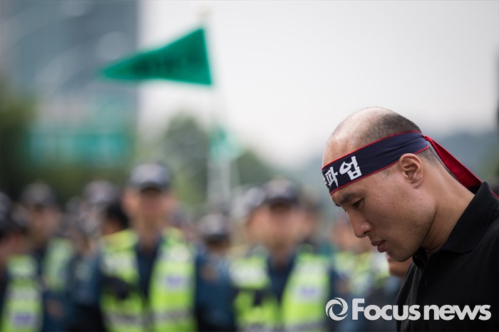 (서울=포커스뉴스) 정부의 일방적인 조선업 구조조정 중단과 현대차 그룹의 성실한 그룹사 공동교섭 참여, 정부의 노동개악 철회등을 내걸며 파업에 들어간 전국금속노조가 22일 오후 서울 서초구 현대자동차 본사 앞에서 금속노조 총파업 대회를 열고 있다.