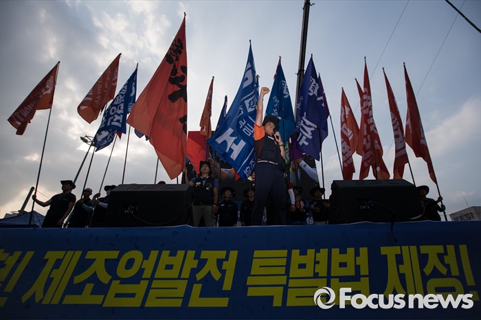 (서울=포커스뉴스) 정부의 일방적인 조선업 구조조정 중단과 현대차 그룹의 성실한 그룹사 공동교섭 참여, 정부의 노동개악 철회등을 내걸며 파업에 들어간 전국금속노조가 22일 오후 서울 서초구 현대자동차 본사 앞에서 금속노조 총파업 대회를 열고 있다.