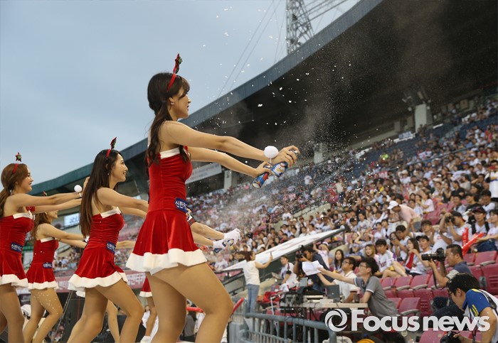 (서울=포커스뉴스) 22일 서울 잠실구장에서 열린 2016 프로야구 두산-LG 경기에서 LG 치어리더가 '섬머 크리스마스' 주제에 맞춰 눈스프레이를 뿌리며 한 여름의 더위를 식혀주고 있다.