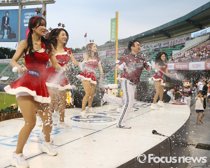(서울=포커스뉴스) 22일 서울 잠실구장에서 열린 2016 프로야구 두산-LG 경기에서 LG 치어리더가 '섬머 크리스마스' 주제에 맞춰 산타 복장으로 눈스프레이를 뿌리며 한 여름의 더위를 식혀주고 있다.